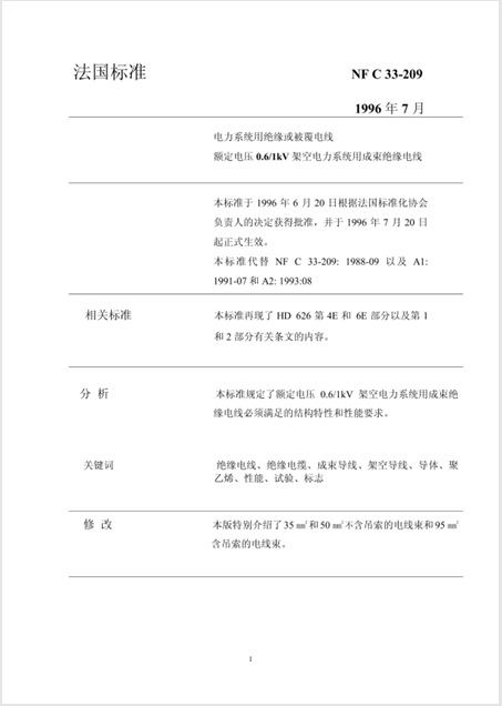 NF C33-209-1996 电力系统用绝缘或被覆电线 额定电压0.61/IkV架空电力系统用成束绝缘电线(不全).pdf