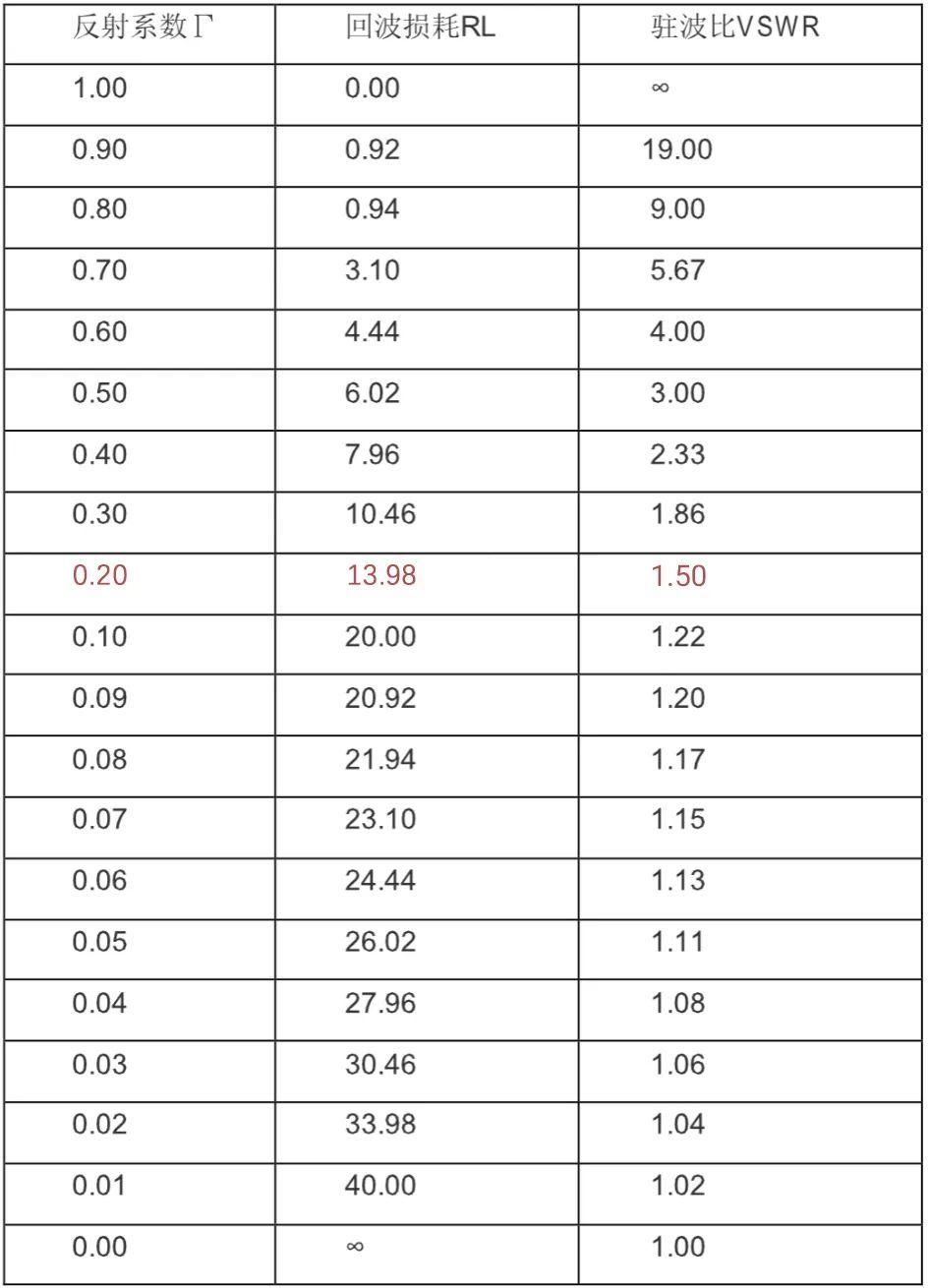 以下列出常见反射系数、驻波比与回波损耗对照表供大家参阅理解:
