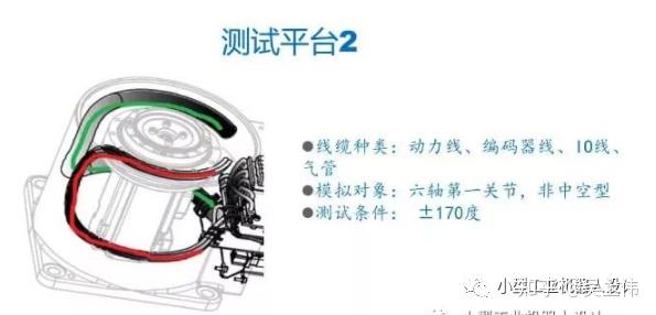 而实际上的机器人状况是多种不同线缆加气管、多种不运动的组合,所以我们当时的做法是,根据企业自身的产品把对机器人分成不同的关节运动,然后把机构简化变成线缆测试平台。这是在初期投入很少的测试,而当产品丰富之后,最直接的当然是直接上机器人测试,或者使用机器人进行改造变成测试平台,因为标准机器人因为外面有防护壳等,要停机检测不太方便。