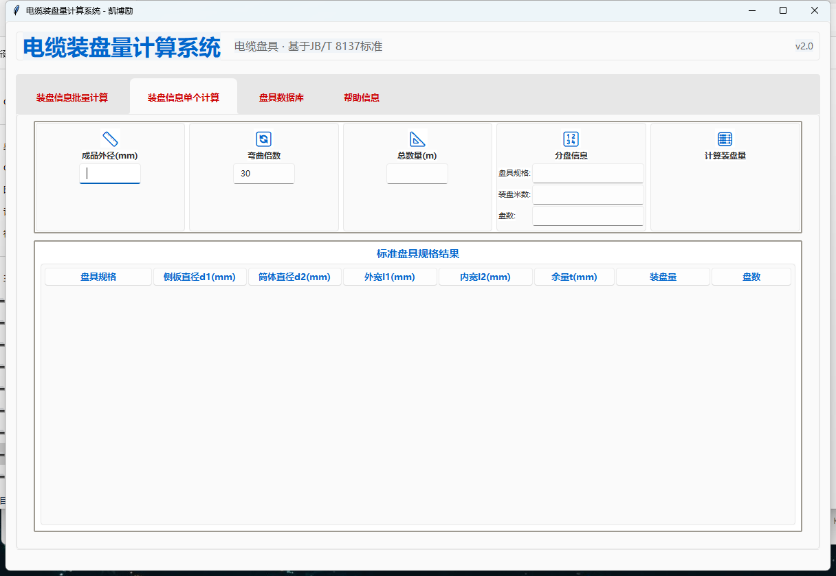 通过导入Excel文档进行批量计算和导出,可单个线径计算,导入非标盘具规格,详细看帮助文件。