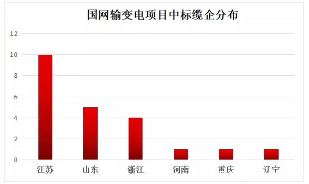 在前5次国网输变电项目变电设备-电力电缆项目招标中,共22家企业中标,分别分布在江苏、山东、浙江、重庆、辽宁、河南6个省。其中江苏省中标企业最多,其次是山东,再次是浙江。