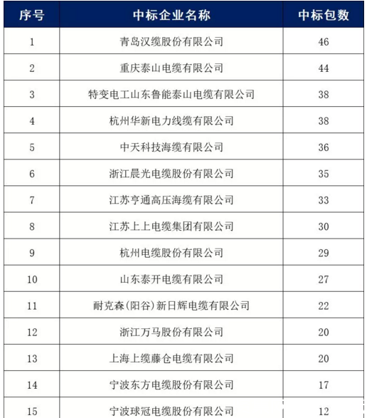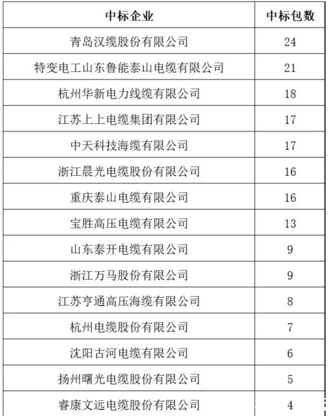 虽说江苏省中标企业居多,但是中标最多的前三名却无一家江苏企业。青岛汉缆股份有限公司以中标24包的优势居首,特变电工山东鲁能泰山电缆有限公司中标21包排在第二,杭州华新电力线缆有限公司中标18包排在第三。去年没中标,今年中标的有睿康文远电缆股份有限公司、无锡江南电缆有限公司、鲁能泰山曲阜电缆有限公司。