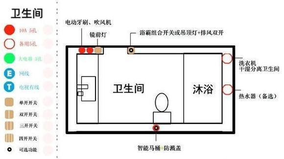 和厨房一样,为了避免安全隐患,卫生间的各个插座最好配备防溅盒,卫生间的插座点位主要提供平时各种卫浴洁具、电器的使用便捷性。