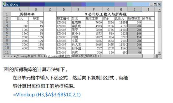 前面一开头提出的计算所得税那个问题,就可以使用Vlookup的模糊查找进行完美解决(具体方法见图1.2)。