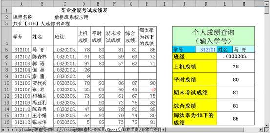 【案例1.2】某校某专业期末考试的数据库成绩表如图的A:H列所示。由于人数较多,要查看某个同学的成绩非常困难。希望能按学号进行查找,即在K5输入某个学号后,就能自动显示出该学号所对应的姓名和各种成绩,如图1.3的J4:M16所示。