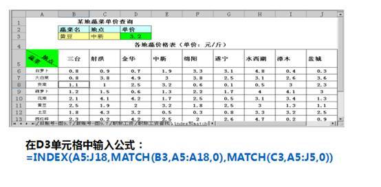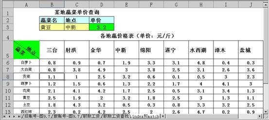 【案例2.1】某地域中各县的蔬菜销售单价表如图2.1的A4:J18区域所示,希望能够快捷地查找到某地某蔬菜的单价。最好是输入地名和蔬菜名,就能看到对应的蔬菜单价,如图2.1的B1:D3区域所示。