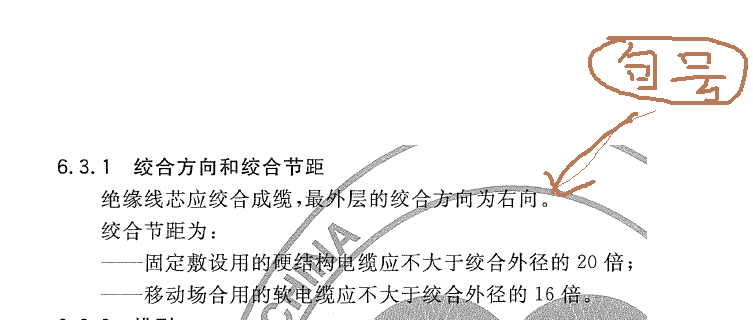 从语文的角度上来说,9330中所说的节径比并没有明确指出是最外层,请注意:“最外层的绞合方向为右向。”这句话后面是句号,所以绞合方向和节径比是单独的描述;当然,一般我们做都是按最外层节径比要求做的;等到9330更新版本后,就会明确规定各层节径比了。现在这个版本的标准不严谨;而且很多错误。