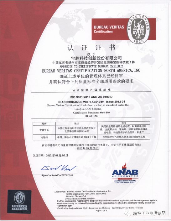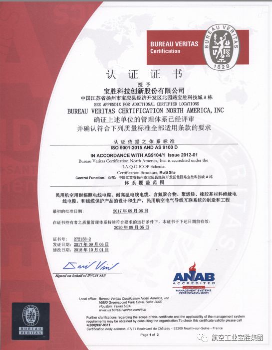 近日,宝胜特缆系统上海研发中心收到了来自必维国际检验集团发放的质量管理体系认证证书,这也标志着宝胜特缆系统上海研发中心顺利通过了线束制造AS9100的质量体系转版及扩证审核。