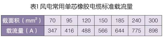 目前风电行业电力电缆载流量的确定主要基于理论计算方法,并充分考虑实际应用环境因素影响。理论计算主要基于IEC标准,国际电工委员会(IEC)标准在1957年在McGrath论文的基础上,结合1957年之后载流量的算法改进,于1982年提出了电缆额定载流量(100%负荷因数)计算标准IEC60287(国内相对应的标准是JB/T10181—2000)。目前各国电缆产品及其载流量大都已向IEC靠拢。表1为根据该标准计算所得风电行业常用的几种单芯橡胶绝缘电缆的标准载流量值。
