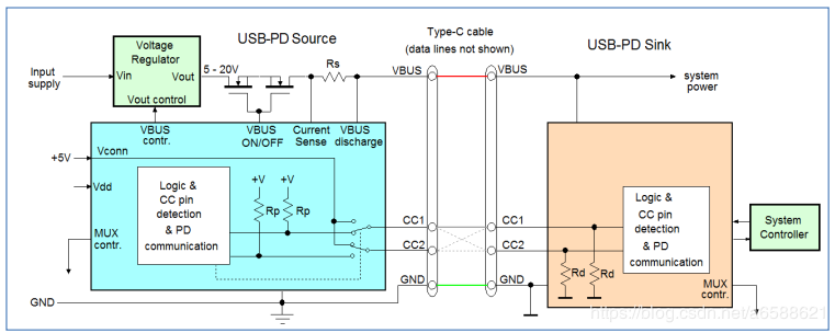 包含PD协议的Type-C 系统从Source到SINK的系统框图大致如下: