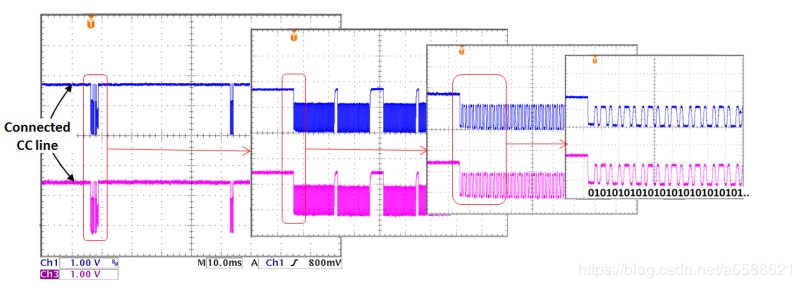 PD协议的通信编码为Bi-phase Mark Coded (BMC),通过CC脚进行通信,如下图。