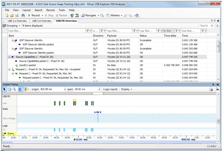 当电缆接通之后,PD协议的SOP通信就开始在CC线上进行,以此来选择电源传输的规格,此部分由Sink端向Source端询问能够提供的电源配置参数(5V/9V/12V/15V/20V)。