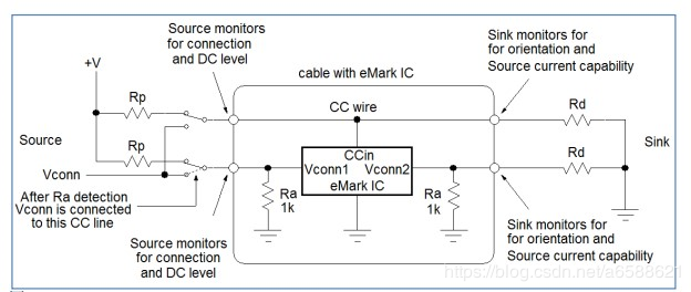 我们注意到,线缆中有1K的下拉电阻Ra,这样在线缆插入的时候,Source会识别到CC1和CC2电压下降的情况,具体的电压会告诉主机那个端子被Sink的5.1K下拉,那个端子被线缆的1K电阻下拉。因此线缆的插入方向也可以被识别到。Source就可以通过开关,给E-Marker提供VCONN。