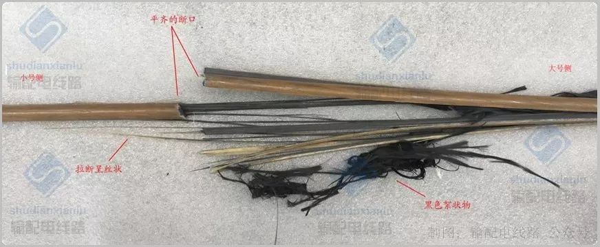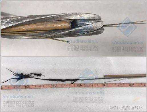 断口两侧芯棒均稍有内缩,该档小号侧仅露出少量玻璃纤维丝。大号侧断口外存在长约 400mm 的黑色丝絮状物质,部分软铝型线上有放电痕迹。