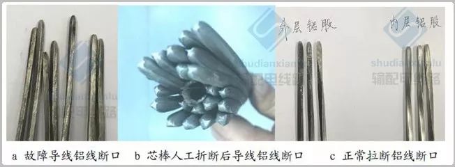 开展了导线正常拉断、芯棒人工弯断后导线拉断的模拟试验,将断口与现场故障断口进行对比,可以看出,无论是故障导线、人工弯断导线还是正常拉断导线,软铝型线断口均呈拉伸紧缩状,无明显差异。