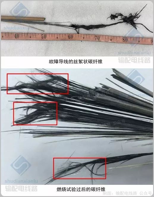 ▲图 故障导线的絮状碳纤维与经燃烧试验过的碳纤维形貌对比