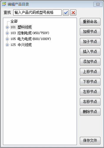 3、除了可以通过表生成产品目录,还可以通本窗口编辑和维护目录树。如果目录树的节点很多,还可以通过产品代码和型号规格进行查找定位。