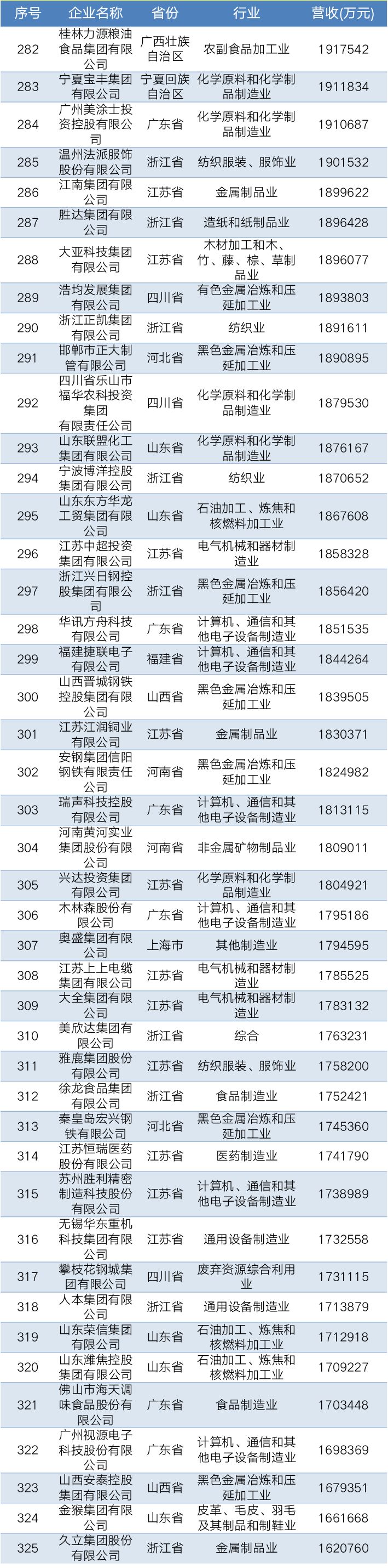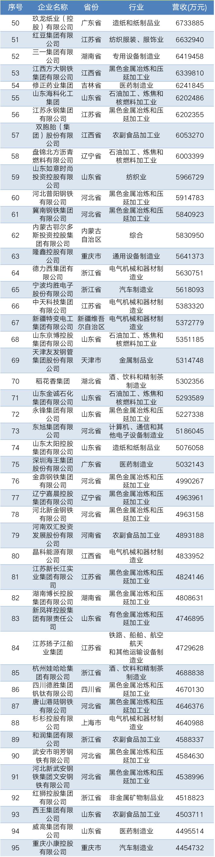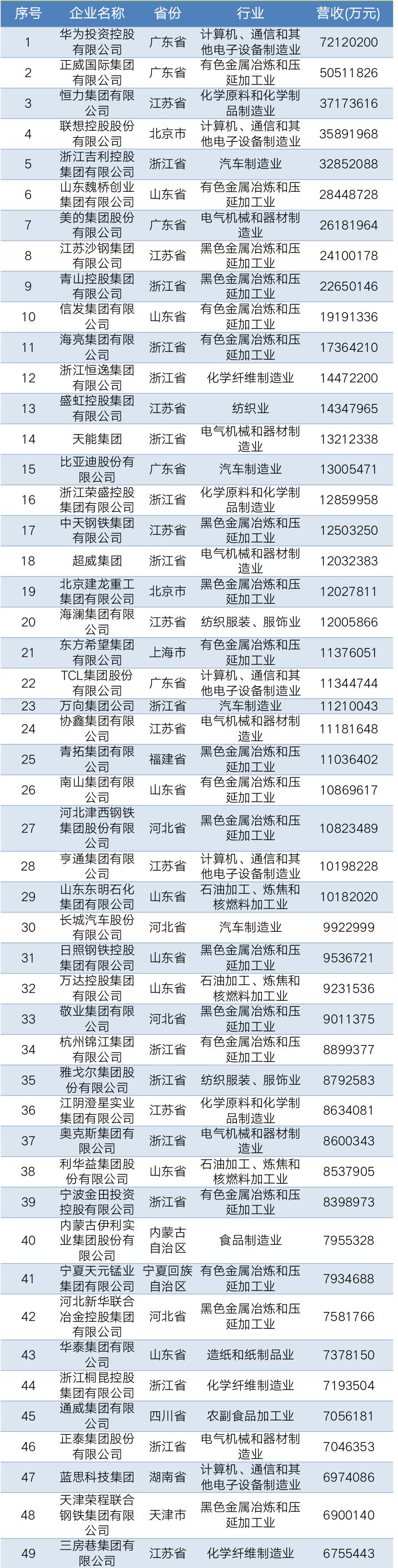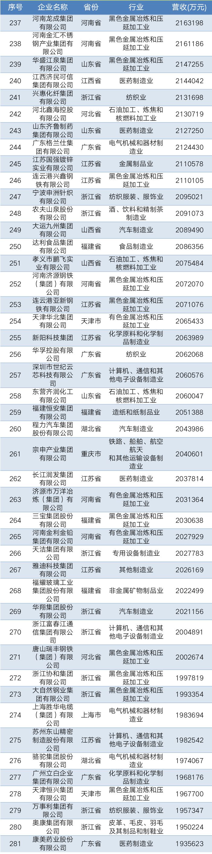 2019中国民营企业制造业500强