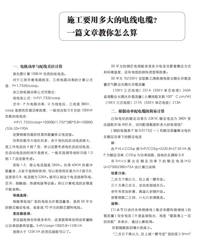 [电缆选型] 施工要用多大的电线电缆?一篇文章教你怎么算
