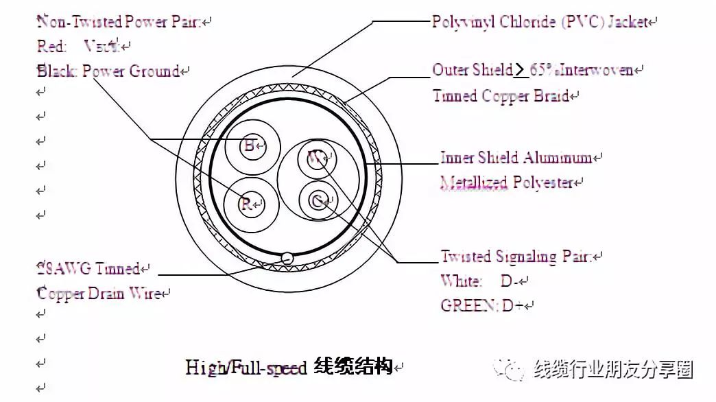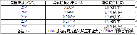 讯号线部分选择,如果考虑直流压降在协会要求的125mV条件,28AWG电源线使用长度建议在1米范围,26AWG电源线建议使用长度不超过1.7米,24AWG电源线建议使用长度不超过2.7米,22AWG电源线建议使用长度不超过4.3米,20AWG电源线建议使用长度不超过5米.按照USB2.0标准测试规格参考.