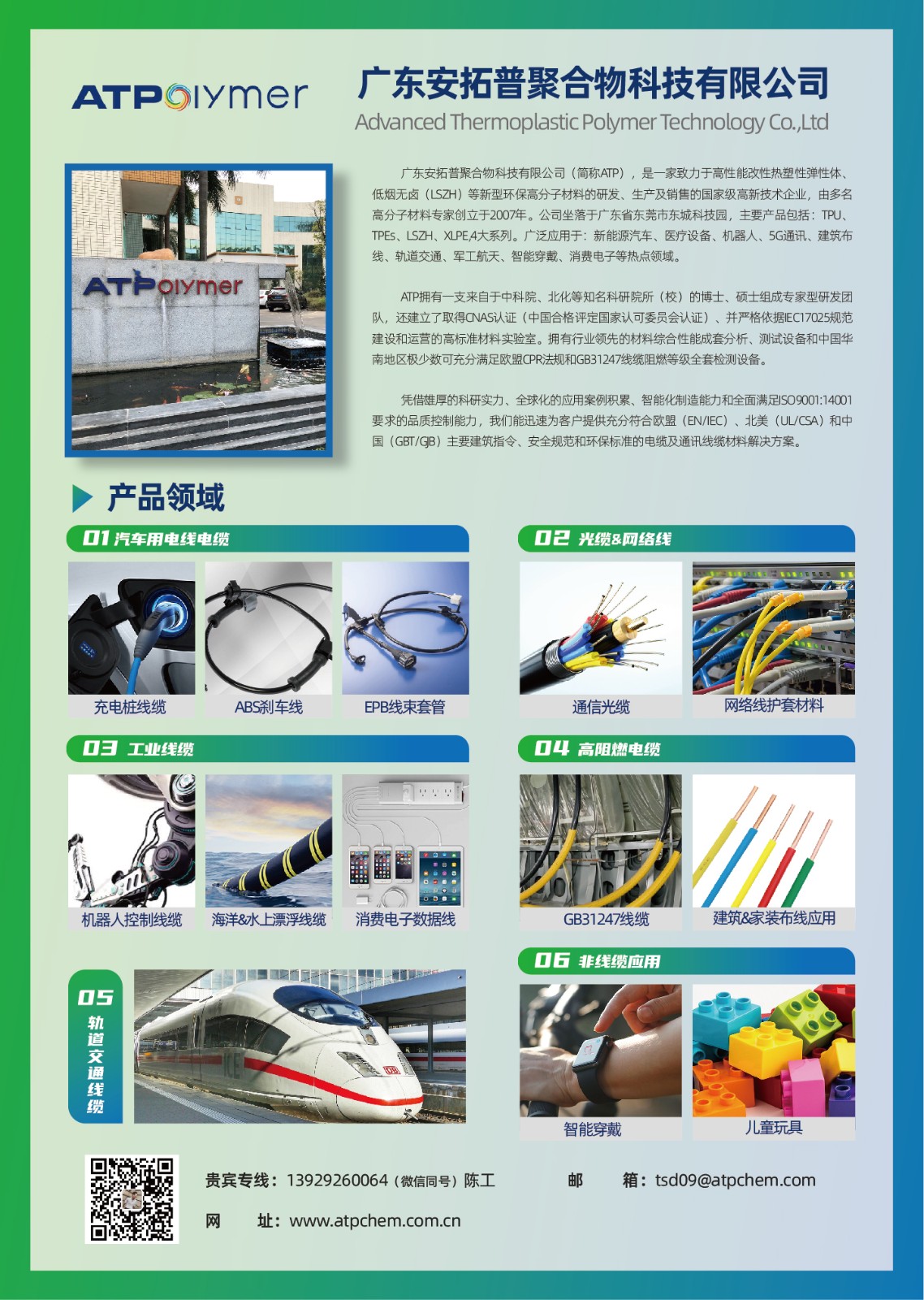 广东安拓普聚合物科技有限公司(ATP),主要产品包括:TPU、TPEs、LSZH、XLPE,4大系列。ATP还建立了取得CNAS认证(中国合格评定国家认可委员会认证)、并严格依据IEC17025规范建设和运营的高标准材料实验室。拥有行业领先的材料综合性能成套分析、测试设备和中国华南地区极少数可充分满足欧盟CPR法规和GB31247线缆阻燃等级全套检测设备。陈工/13929260064