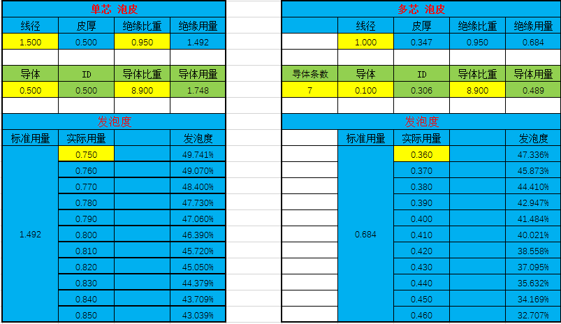 傻瓜式“发泡度”在线换算,一键计算发泡度,是电线电缆小白的福星,只需输入你公司标准工艺的数据,如:绝缘线径,导体线径,和你实际发泡皮重就能一键计算发泡度。