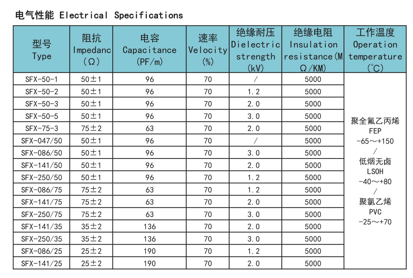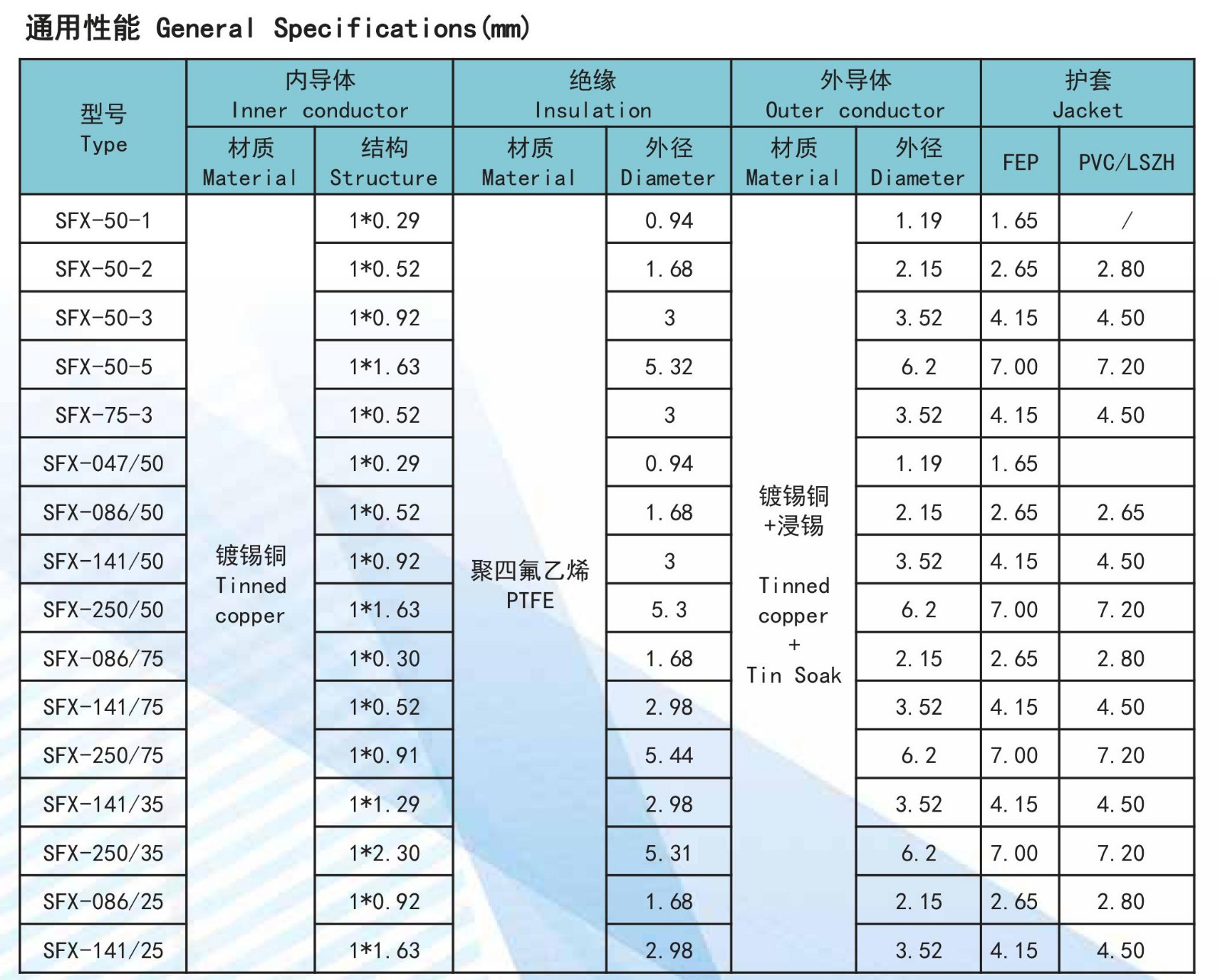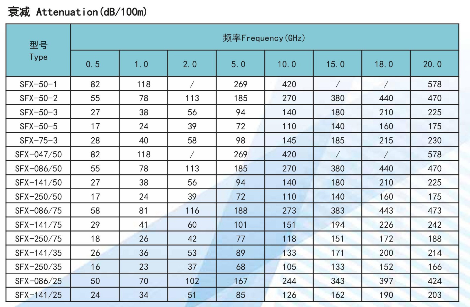 SFX半柔射频同轴电缆可作通讯、电子对抗、导航等射频信号传输系统中的机内联线、延迟线等. 半柔电缆已成系列, 主要产品有50Ω、75Ω等不同特性阻抗的产品, 采用铜线编织、整体镀锡外导体, 与半硬同轴电缆相比具有较好的柔软性。