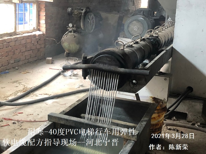 2021年3月,河北宁晋某公司,生产电梯、行车用弹性体软扁电缆。以前用别人生产的PVC电缆料,生产的电缆运往东北地区,冬天放在仓库出现自然开裂现象,电缆完全报废。为了能够自已把控质量,同时也为了降低进货成本。老板决定自已生产电缆料自已使用。请陈新荣工程师13812900213上门技术指导,生产-40--+70度PVC电梯、行车用弹性体软电缆配方。用最简陋的便宜机器,低成本、低投资生产优质电缆料。经放线检验,电线表面光亮细腻,塑化良好,强度超过预计,低温满足要求。客户非常满意。