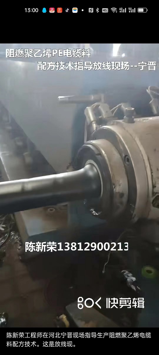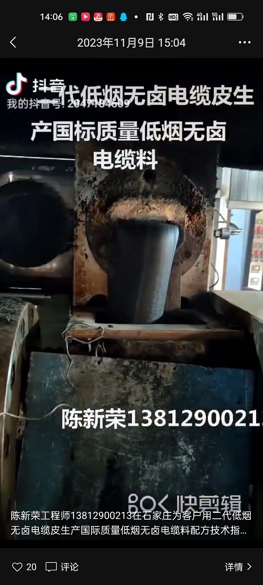 2023年11月,石家庄新乐一公司请陈新荣工程师教用二代低烟无卤电缆皮再生产国标质量的低烟无卤电缆料。该公司原来把电缆皮粉碎后,造成颗粒,卖给电缆料厂家由电缆料厂家改进后生产出合格的电缆料销售给市场。但该公司利润很少,利润大头被电缆料厂家挣去了。所以该公司想自己改进颗粒提升质量,直接销售给电缆厂家,这样利润就最大化了。经过陈新荣工程师的配方调整,产品质量满足了用户的要求,质量达到国标要求。该公司原来利润每吨只有二百元,经陈工教配方后每吨利润达到二千元。客户非常高兴。