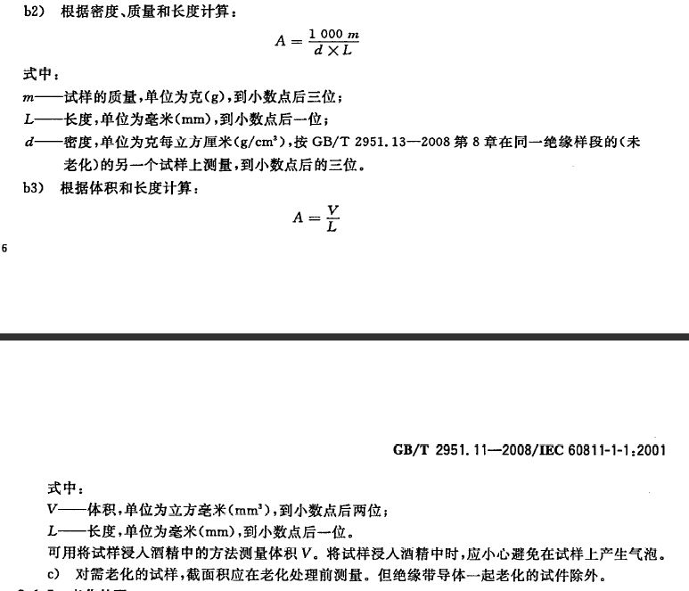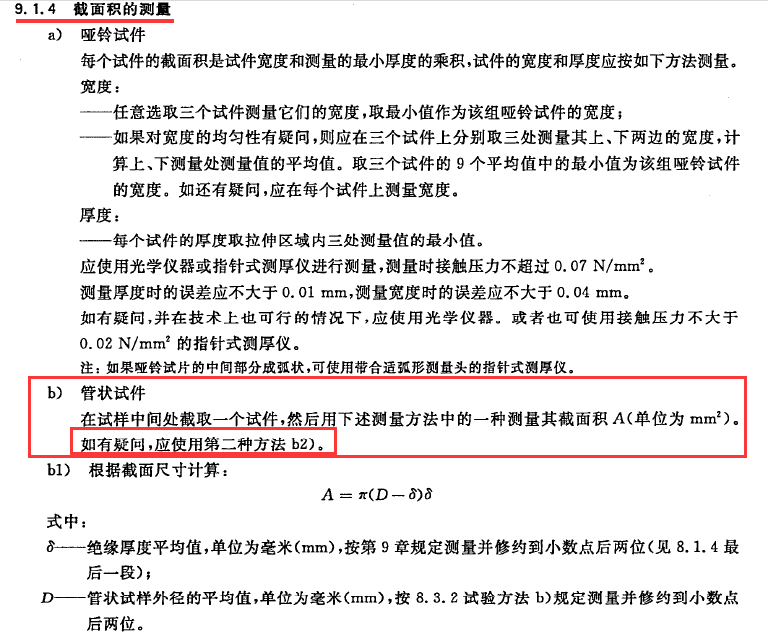 好吧那我的疑问就是,如果是你检测BV2.5这种小截面类型电缆的绝缘拉力试验,需要用质量、密度和长度这样的方法来确定管状试件的截面积吗?或者还是用b1方法,用测量带测量周长来计算平均外径,然后计算求出截面积?