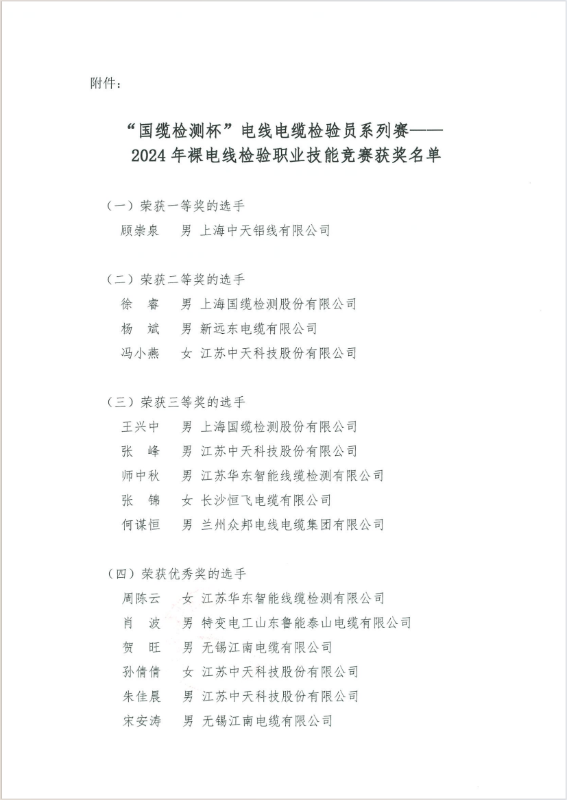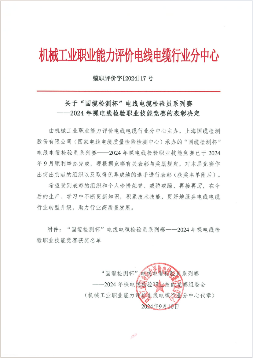 [行业新闻] 2024年裸电线检验职业技能竞赛的表彰决定