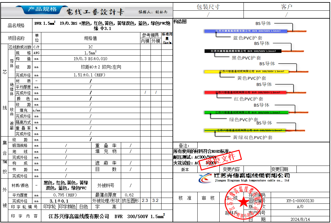 [布电线缆] BVR 1.5mm2电线工艺设计卡片