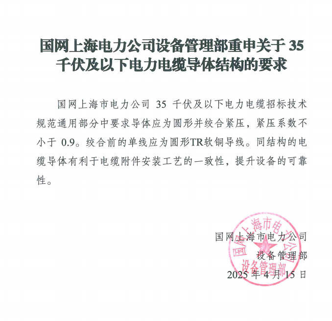 国网上海电力公司依据国网电缆标准明确规定异型导体不得使用!