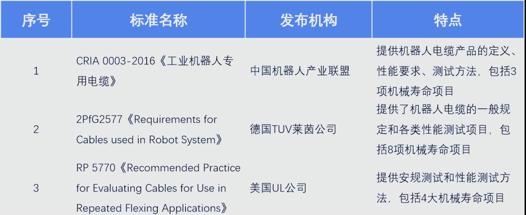 国际与国内标准规定,机器人电缆的质量和性能由行业与企业标准主导。国际上有TUV莱茵公司的2PfG2577,国内有CRIA 0003-2016标准,这些标准确保了产品质量与性能。