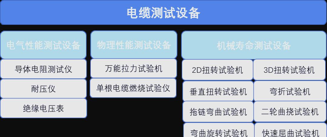 电缆性能测试项目包括电气性能试验、物理性能试验以及机械寿命试验。在上述标准中,规定了这些试验项目,被详细分类并提供了质量和性能的基础保障。