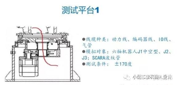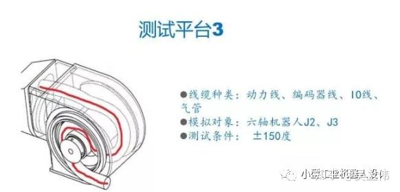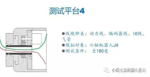 而实际上的机器人状况是多种不同线缆加气管、多种不运动的组合,所以我们当时的做法是,根据企业自身的产品把对机器人分成不同的关节运动,然后把机构简化变成线缆测试平台。这是在初期投入很少的测试,而当产品丰富之后,最直接的当然是直接上机器人测试,或者使用机器人进行改造变成测试平台,因为标准机器人因为外面有防护壳等,要停机检测不太方便。