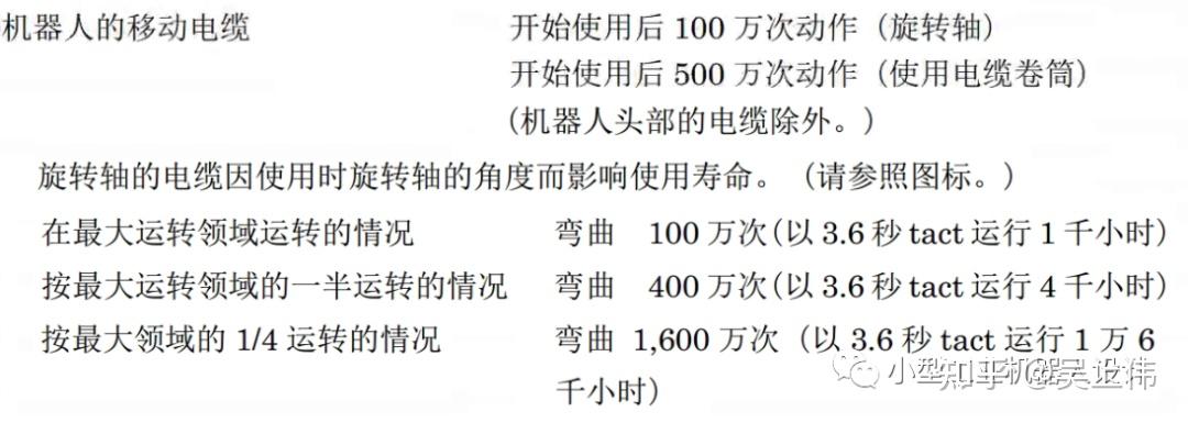 2、本质上来说,线缆跟电机减速机一样,也是需要定期检查更换的。而更换周期跟测试平台的测试周期不同测试平台是长期大角度高速运动,而实际机器人绝大多数是有停顿,这不仅是扭转角度问题,还有热量积累问题,持续的扭转会有能量的集中,磨损更快,这里不是线性的,而是指数型降低。关于更换周期,不同厂家的建议值不同,但大多并不是到期就换,而是定期检查,有隐患才换,毕竟一套线换下来可不便宜。不同厂家建议更换周期不同,下面只是某一家的参考。