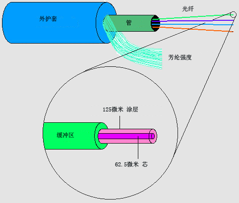 光纤电缆有很多不同类型,在这里我们回介绍一个最常见的类型,62.5/125微米,该数字代表直径光缆的核心,这是衡量在微米到百万分之一米,缓冲式光缆可以用于室内或室外,这种电缆通常在管道中充满凝胶作为防潮防水之用。光缆可以由4至144根光纤的松套管构成。