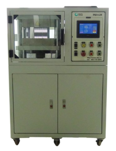 原科放于铸模内,夹于本机电热平板间加以压力及温度,使原料成型,以供试验,做为工厂大量生产配料之依据。本机装有PLC程式控制彩色触摸屏,人机界面操作系统,可设定压力、温度、时间和次数硫化过程即时显示和监视,所设模压程序全数自动完成,先进可靠。