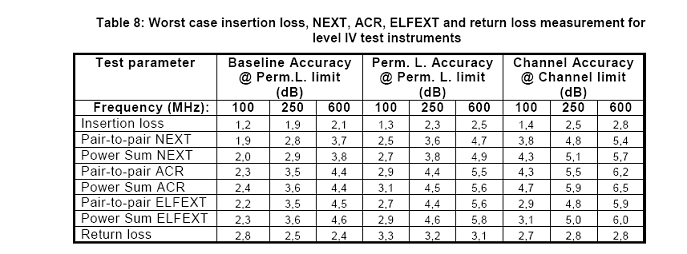 表1 还引出了另一个迄今没有讨论的话题。标准既定义了基本仪器(也称为基线精度)的精度,也定义了仪器带有为测试永久链路和通道的适配器后的精度。一些厂家仅仅会提及基线精度。在实际应用中这是一个误导性的概念,因为无论是测试永久链路还是通道,测试仪总是要与测试适配器一起工作的。标准确实计划在定义基线精度的同时为这些在测试实际链路时所必须的适配器制定严格的性能要求。