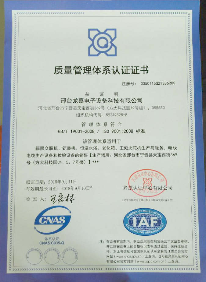 电线电缆网 > 行业资讯 > 祝贺邢台龙嘉电子设备科技有限公司顺利通过IS9000认证!(完整版)