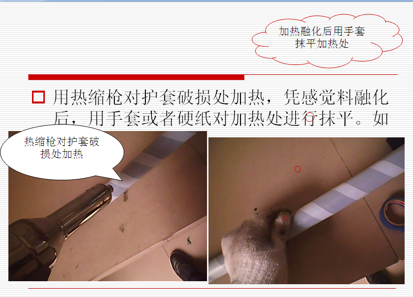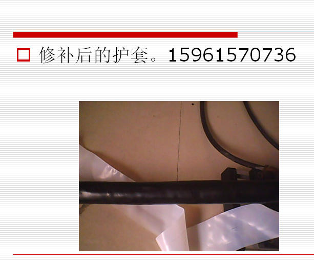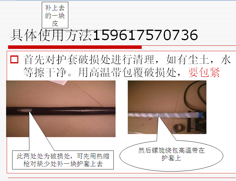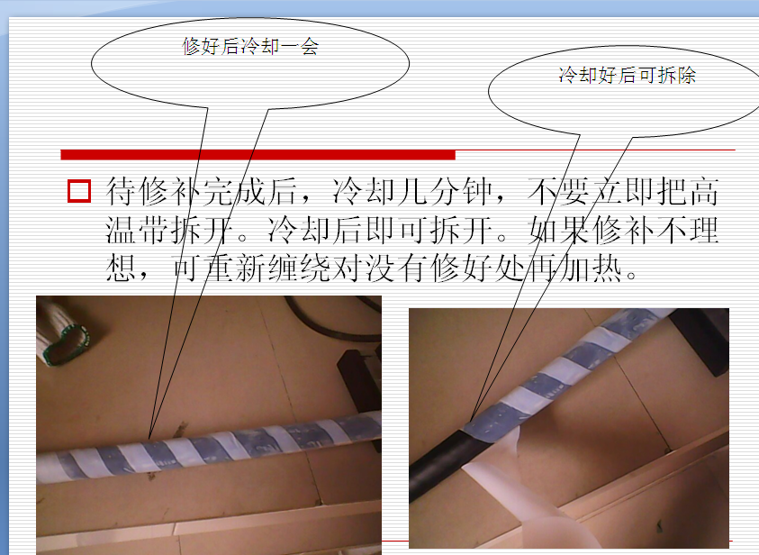 有个PPT,论坛上传不了,绝缘主要是针对蒸汽交联后本体修复不上,用绝缘修复带缠绕到需要的厚度后报一层高温带加热,直到和本体融为一体即可;护套高温带是在破损处先用本体黏住,然后包一层高温带,用火源对四周均匀加热,戴手套用手抚平即可,如果要PPT演示文档,留下邮箱,我私发