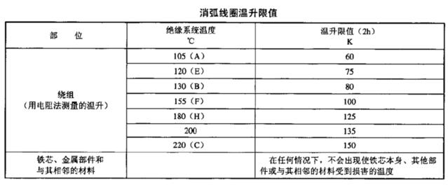 消弧线圈在额定电流下2h温升限值不应超过下表的规定, 绕组温升应按其绝缘耐热等级考虑。