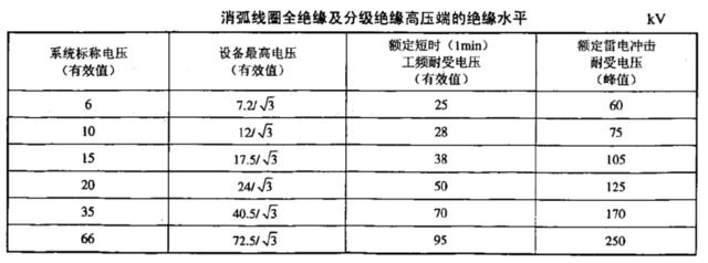 2)、消弧线圈主绕组全绝缘及分级绝线高压端的绝缘水平应符合下表规定。