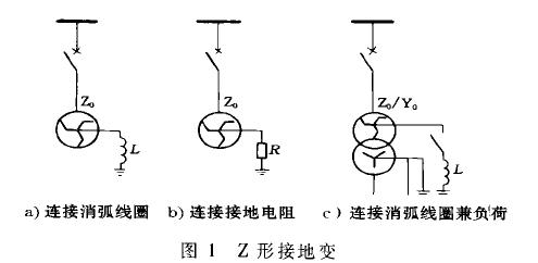 在系统为△型接线或Y型接线中性点无法引出时,引出中性点用于加接消弧线圈,此类变压器采用Z型接线(或称曲折型接线),与普通变压器的区别是每相线圈分别绕在两个磁柱上,这样连接的好处是零序磁通可沿磁柱流通,而普通变压器的零序磁通是沿着漏磁磁路流通,所以Z型接地变压器的零序阻抗很小(10Ω左右),而普通变压器要大得多。用普通变压器带消弧线圈时,其容量不得超过变压器容量的20%。而Z型变压器则可带90%~100%容量的消弧线圈。接地变压器为三相变压器(或三相电抗器),主绕组用来连接到要求接地系统的三相,并引出中性点端子接到消弧线圈上。接地变压器可以带有一个低电压的二次绕组,该绕组可具有连续供电容量, 接地变除可带消弧圈外,兼作站用变。其容量应与消弧线圈的容量相配合,并采用相同的定额时间,而不是连续时间。如果接地变压器兼作站用变压器,接地变压器一次绕组的容量为消弧线圈的容量与站用变的容量之和,二次绕组的容量为站用变的容量。接地变压器的特性要求是:零序阻抗低,空载阻抗高,损失小。