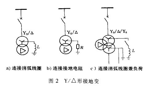 在上述接地变的几种结构型式中曲折形的,Z0/Y0型接地变(见图1c)和Y/△的Y0/△/Y0型接地变(见图2c)在用于连接消弧线圈的同时,还可以