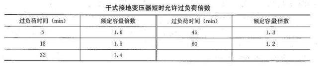 4.2.3、接地变压器容量选择应满足系统的热稳定要求,在计算时应考虑接地变压器短时过负荷容量。根据短时过负荷持续时间将短时容量换算为持续额定容量,当无变压器厂家资料时,接地变压器短时允许过负荷倍数可参考下表。