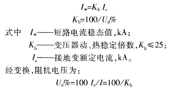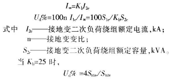 由于不带二次负荷接地变的阻抗电压,在Kb范围内的计算值都能满足短路电流对接地变动、热稳定的要求,因此为减少体积和造价,Kb可取最大值25,使不带二次负荷接地变的阻抗电压可确定为最小值4%。