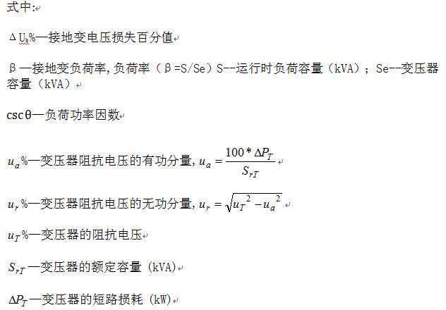 为保证带二次负荷接地变满足对负荷供电电压质量的要求,必须根据接地变各负荷绕组的阻抗电压分别计算其对供电电压的损失,再根据二次负荷用电设备端的电压偏移允许值要求和线路电压损失的具体情况,确定接地变的电压损失允许值。最后综合考虑二次负荷情况(含有、无大电动机自起动)、接地变电压损失允许值和接地变造价等因素,确定接地变的最佳二次负荷绕组的额定容量。接地变的电压损失可按下式计算: