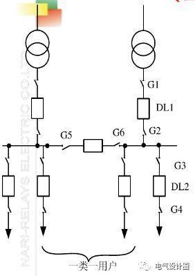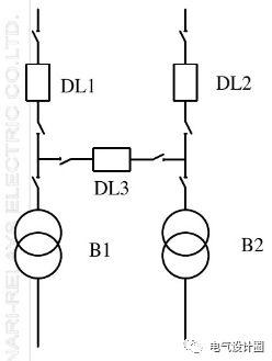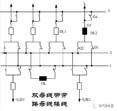由于有两组母线,可以做到相互备用。两组母线之间用母线联络断路器DL连接起来,每一个回路都通过一只断路器和两只隔离开关接到两组母线上。当运行时,接至工作母线上的隔离开关接通,接至备用母线上的隔离开关断开。